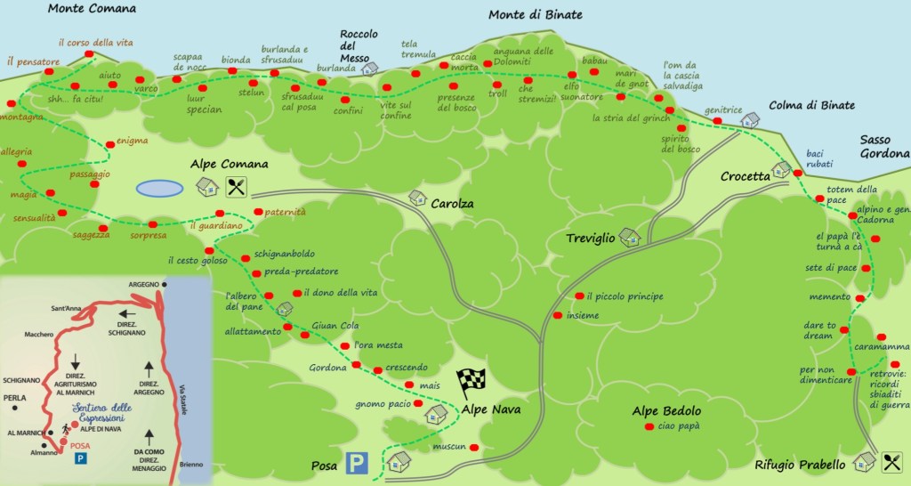 della splendida conca dell’Alpe Comana, dove sono presenti un piccolo lago (bolla), dei fabbricati rurali e un Agriturismo. Dall’alpeggio, con una ripida, ma breve salita, si raggiunge la panoramica cima del Monte Comana, da cui si apre una spettacolare vista sul Lago di Como. Si prosegue nel bosco, seguendo il filo di cresta, in direzione del Roccolo del Messo, antica struttura per la cattura degli uccelli recuperata da ERSAF e della Colma di Binate, lungo l’itinerario denominato “La Conca di Schignano”. Alcuni pannelli didattici riportano le informazioni sulle architetture rurali della valle e sugli alpeggi di proprietà regionale. Dalla Colma di Binate si prosegue in quota raggiungendo loc. Crocette per poi dirigersi lungo la mulattiera verso le falde del Sasso Gordona, dove sono dislocate le ultime sculture lignee e dove è possibile visitare le trincee della cosiddetta “Linea Cadorna”, sistema difensivo della Prima Guerra Mondiale. Dalle Crocette è possibile ridiscendere verso la frazione Posa lungo l’antica mulattiera, chiudendo in tal modo “ad anello” l’itinerario del Sentiero delle Espressioni.